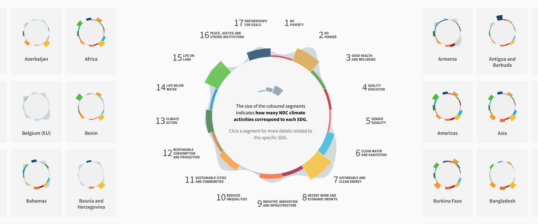 On the overview level, every country has its own chart that shows its particular climate activities and to which sustainable development goal it relates. In addition to the overview charts, a more sophisticated radial chart was developed for showing a higher level of detail. The radial chart visualizes the activities for each individual country or region and for each individual activity.