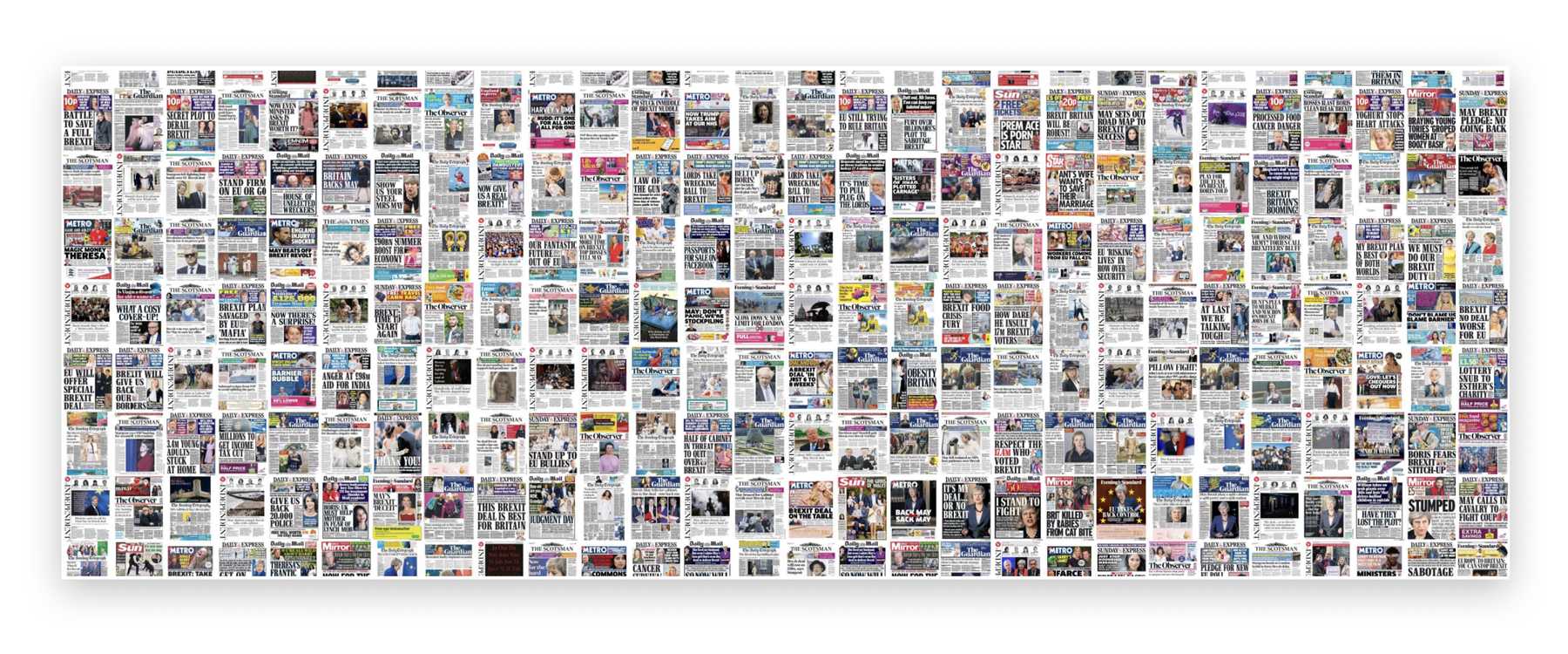For this project, Zeit Online collected roughly 45,000 UK newspaper front pages and analyzed their content. 2,393 cover images were classified to contain news related to Brexit. The idea of this visualization was to tell the story of what led to Brexit from a media perspective.