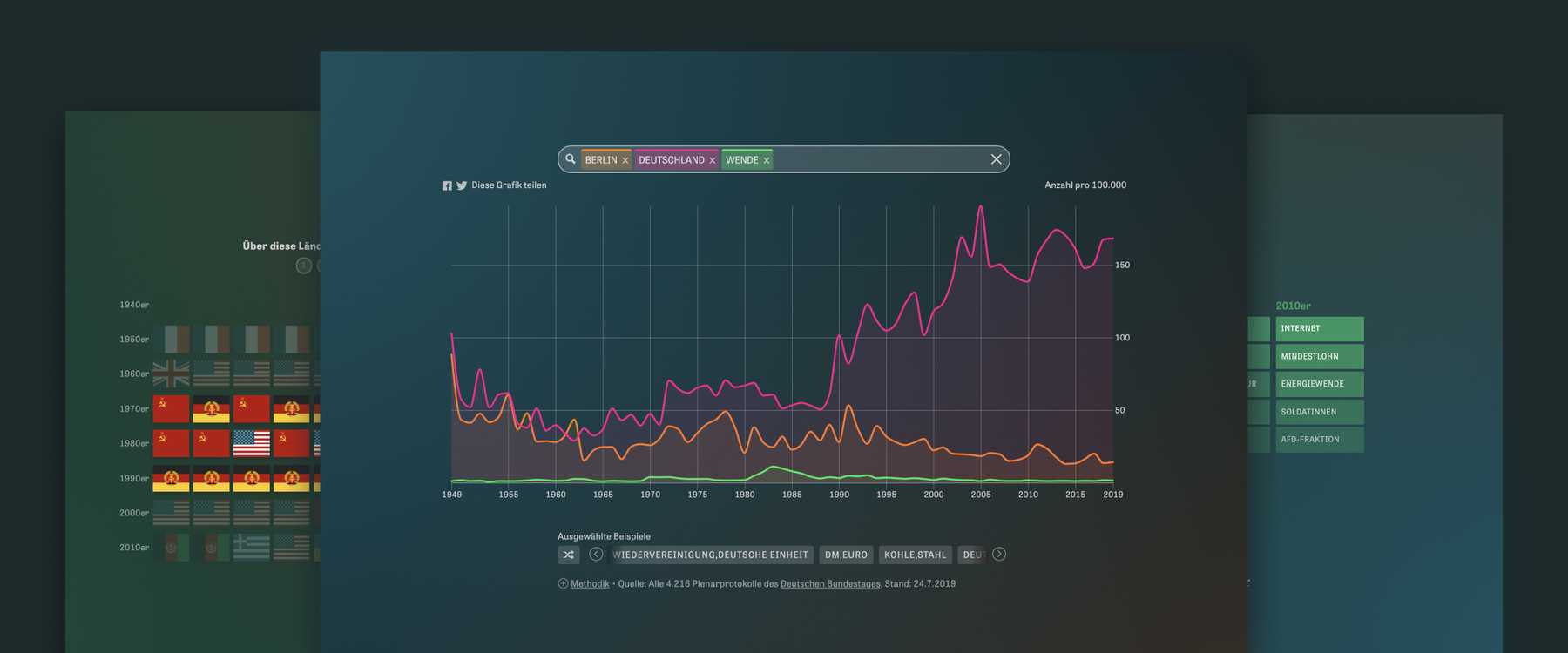 Using the wordcounter, we were able to build another prototype of an API, which allowed us to search for a word in the parliament transcripts and get the time series frequencies of this particular word. This research tool was used to find interesting words for the article and as a proof of concept.